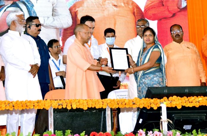 मुख्यमंत्री योगी आदित्यनाथ ने 15 आश्रितों को पांच-पांच लाख रुपये का दिया प्रतीकात्मक चेक